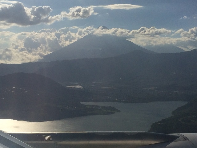 Wir haben gerade das Frühstück serviert bekommen. Es ist sechs Uhr morgens in Guatemala, 13 Uhr in Madrid. In 40 Minuten landen wir. Es ist wolkig, am Boden braun und trocken.