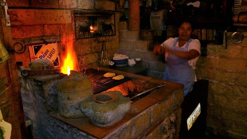 Den Mittagshalt beim Restaurante Katok nutzen wir für eine Zwischenverpflegung. Ich geniesse eine für die Gegend typische Spezialität, spezielle Würstchen auf schwarzen Maistortillas.