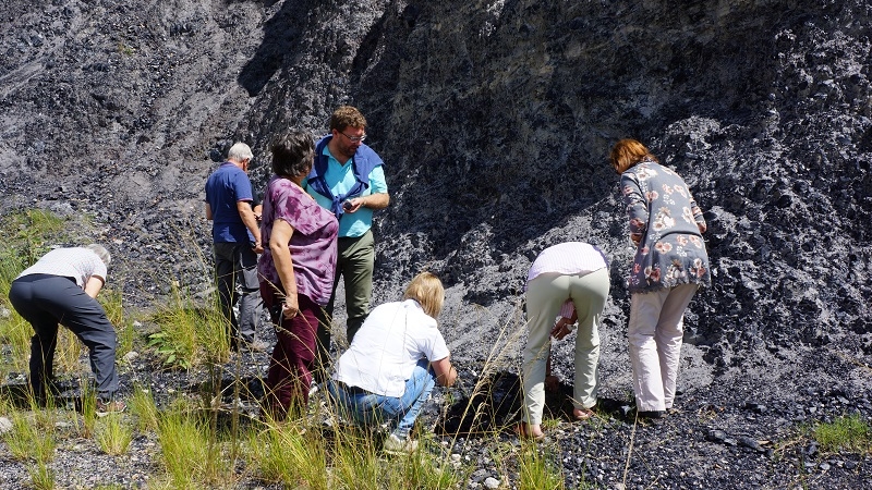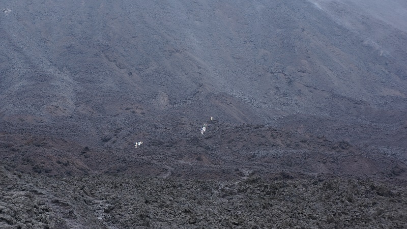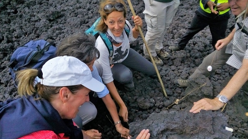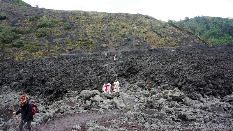 Am Fuss des Lavakegels angekommen, können wir beobachten, wie immer wieder Rutsche von Lavabrocken ausgelöst werden. Zeitweise sehen wir auch weit oben fliessende, rotglühende Lava. Das ganze Geschehen wird von deutlich hörbaren Kullergeräuschen begleitet. Unser Guide führt uns noch ein gutes Stück hinein in die mit unterschiedlich grossen, scharfkantigen Brocken durchsetzte Fläche. Und plötzlich spüren wir die Wärme, die aus den Spalten heraus strahlt. Unser Guide packt Steckchen und ein Pack Marshmallows aus seinem Rucksack, zeigt uns, wie diese in den heissen Löchern grilliert werden können , und schon bald befolgen wir alle seinen Instruktionen. Nach rund einer Minute sind die süssen Mocken schön weich und schmecken uns.