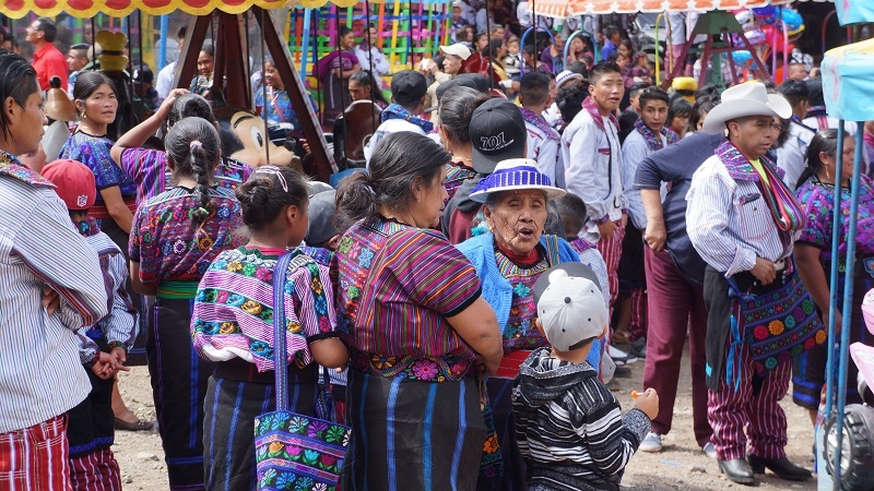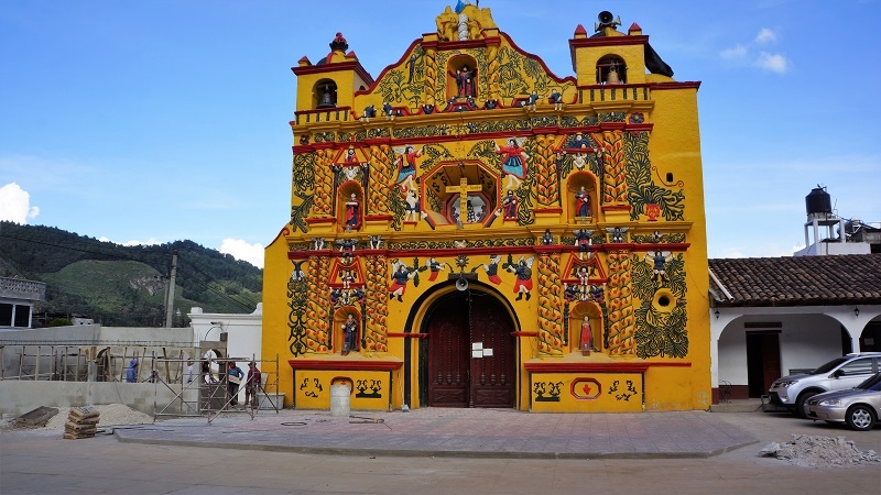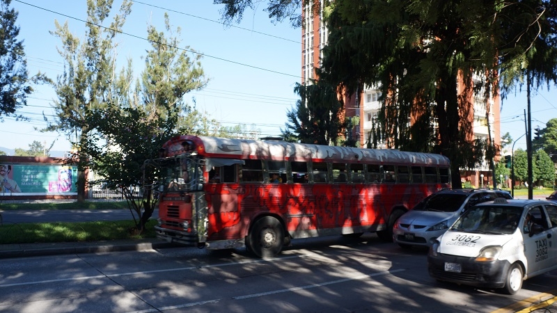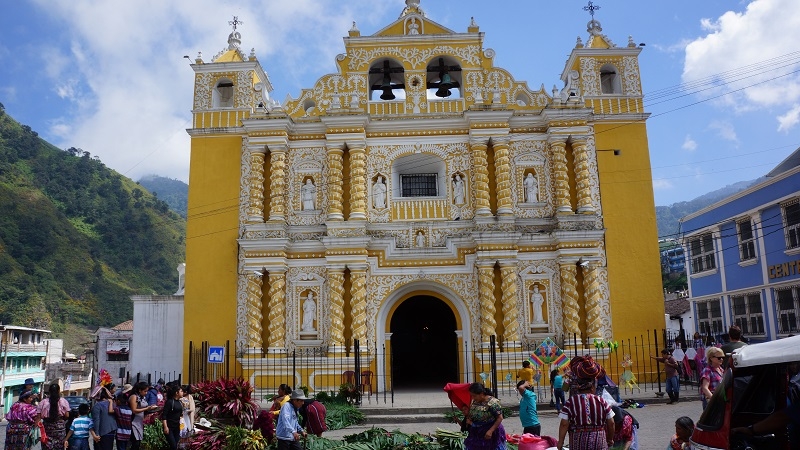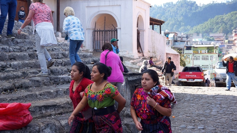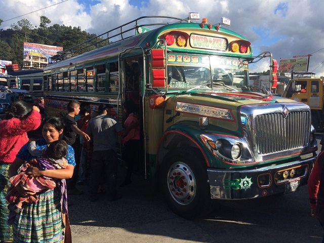Der nächste Halt gibt uns einen Einblick, wie der ÖV hier funktioniert. Bei der Kreuzung Quattro Caminos beobachten wir eine Zeitlang, wie die Busse, übrigens bunt lackiert, mit imposanten Fronten und silbernen Hörnern versehen, am Strassenrand anhalten. Bunt gekleidete und schwer bepackte Passagiere, vorwiegend Indigenas, steigen ein und aus. Ausrufer dirigieren sie lautstark zum richtigen Bus und sorgen dafür, dass sie den Einstieg nicht verpassen, ein Chaos sondergleichen. Da schätzen wir es, dass wir ohne Eile und Drängen unseren Bus wieder besteigen können. Und der fährt uns als nächstes nach San Andrés Xecul.