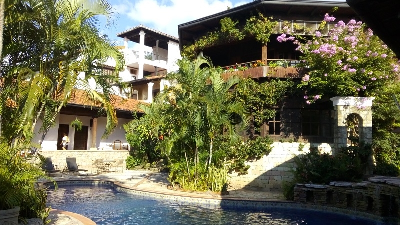 Für die Strecke Grenze-Copán ist unsere Geduld gefordert, denn wir müssen zwei riesigen Sattelschleppern folgen, die einfach nicht vorwärts kommen, da die Strasse verbreitert wird, der Belag aufgerissen wurde und an vielen engen Stellen auch der Gegenverkehr durchgelassen werden muss. Entschädigt werden wir durch tolle Sonnenuntergangs- und Dämmerungsbilder in diesem wilden Berggebiet. Über fast halsbrecherische anmutende Natur- und Kopfstieinpflasterstrassen erreichen wir bei Dunkelheit unser Hotel – ein Juwel. In einem Innenhof voller Pflanzen liegt ein Swimmingpool, verschiedene Treppen führen zu den grosszügigen Zimmern, da und dort plätschert Wasser in ein Becken und ein prachtvoller Garten gehört ebenfalls dazu.