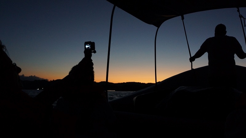 Die Rückfahrt gerät zur Boatparty, dank Christas Musik auf dem Handy uns ihrer Cuba Libre-Spende an alle Mitreisenden. Das Wetter tut das Seine dazu. Hinter und über den drei Vulkanspitzen durchzucken Blitze den dunkler werdenden Himmel, das ferne Donnergrollen wird von der Musik übertönt. Bei Dunkelheit erreichen wir unser Hotel.