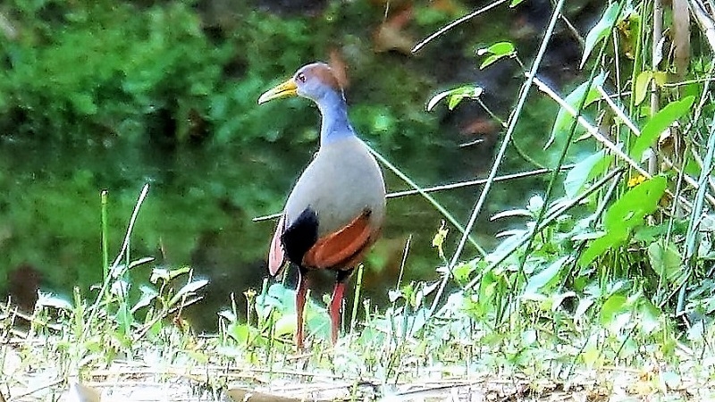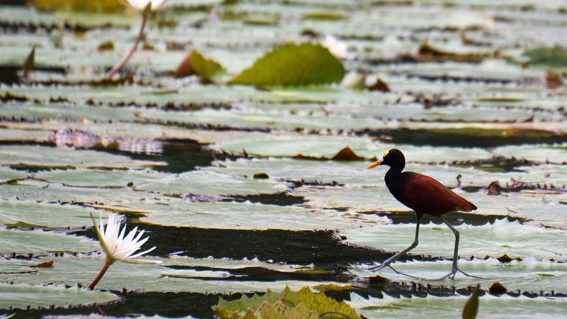 Mit zwei Booten fahren wir nun den Dulce River hoch Richtung Lago de Izabal. Unser Schiffführer fährt ans Ufer und in Buchten, wo sich unter anderen auch ein Leguan und die bereits vor dem Frühstück gesehenen Vögel beobachten lassen. Dazu kommt noch ein Gelbstirn-Blatthühnchen.