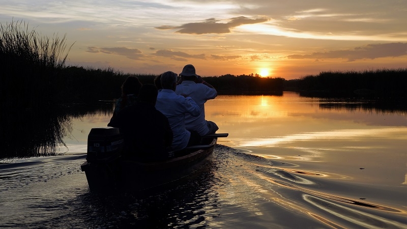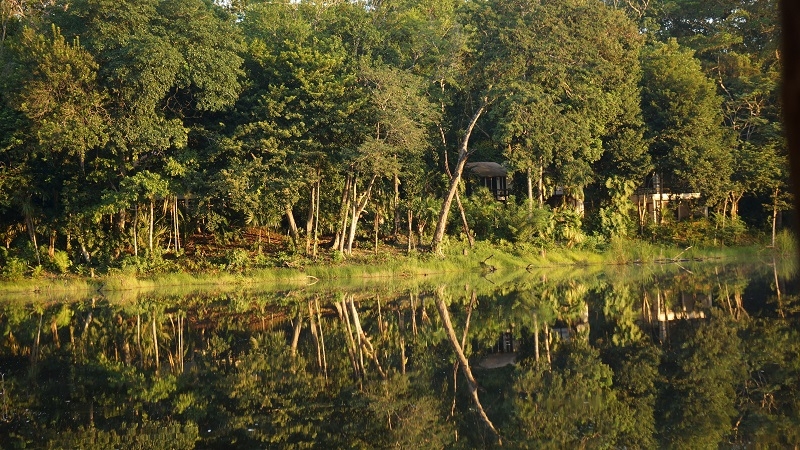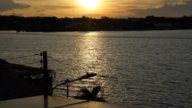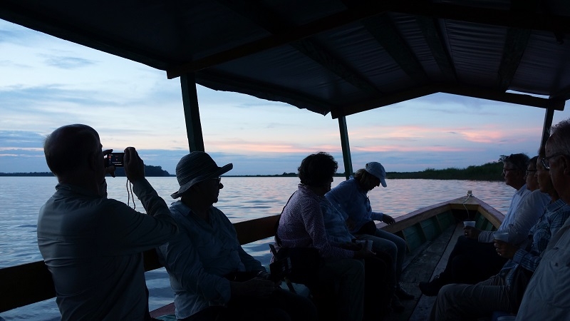 Die Rückfahrt zur Lodge erfolgt mit dem Boot. Und da offeriert René uns allen noch einen Cuba libre. Dabei werden wir aufgefordert, mal ganz stille zu werden und den Stimmen der Natur bei untergehender Sonne zu lauschen. Das animiert darauf einige Teilnehmer, ein Lied anzustimmen. So kommen wir bei Dunkelheit in der Lodge an, gehen duschen und geniessen anschliessend das in der Lodge-Küche zubereitete köstliche Abendessen. Da bereits kurz nach neun das Licht ausgeht und das Bier alle ist, kehrt schon bald Nachtruhe ein.