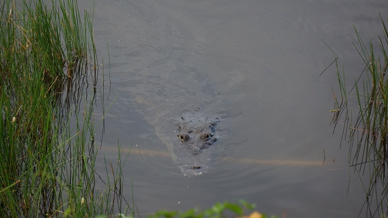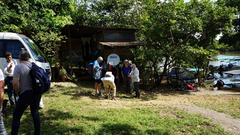 Vor dem Morgenessen unternehmen wir einen Spaziergang am Seeufer. Da gibt es schon etwas zu sehen. Auf dem gegenüberliegenden Ufer besetzt eine Kolonie Silberreiher mehrere Bäume und auf unserer Seite macht sich einer der bisher unbestimmten Vögel bemerkbar. Auf dem Spaziergang hören wir immer wieder das Klopfen eines Spechtes und begegnen einem scheuen Hühnchen, wahrscheinlich ein Sumpfhuhn. Nach dem Morgenessen, das aus einem Früchtecocktail, einer Omelette mit Garnitur, Toastbrot, Butter und Marmelade sowie Kaffee mit Milch besteht, werden wir noch ans Seeufer gerufen. Da zeigt sich ein Krokodil im Wasser, das allerdings vom Kellner mit Brot gefüttert wird.