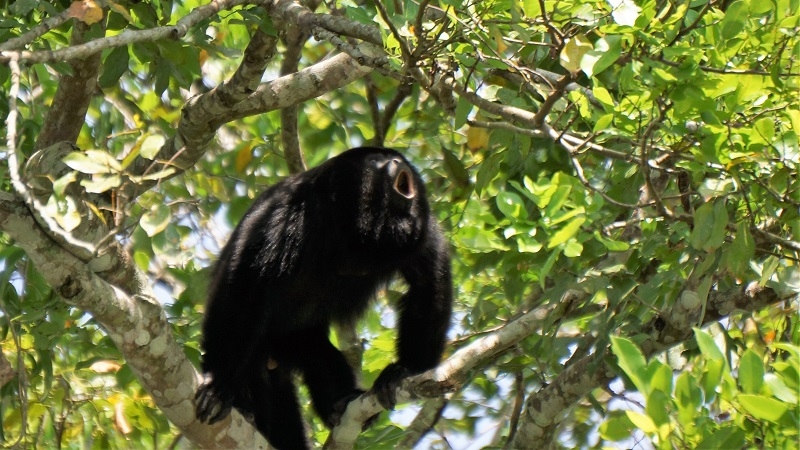 Danach geht unsere Reise im Bus weiter. Wir haben für die kommende Nacht den Rucksack gepackt, denn der Koffer bleibt im Bus. Über Flores werden wir an den Rio Pasion gefahren, wo wir in ein Langboot umsteigen. Dieses führt uns zur Chiminos Island Lodge am Ufer der Laguna Petexbatún, wo wir zum Mittagessen erwartet werden. Auf der Fahrt begegnen wir u.a. einem rotbraun gefärbten Adler mit hellem Kopf und zweimal je einer Gruppe Brüllaffen. Sie bewegen sich in den Kronen hoher Bäume und geben mit lautem Brüllen und Knurren kund, dass ihnen unsere Anwesenheit in ihrem Revier absolut missfällt. In der Lodge angekommen, gibt es eine leckere Guisquilsuppe, eine Art Kohlgemüse, fein zubereitetes Hühnchenfleisch mit Reis und Gemüse und zum Dessert Wassermelone.