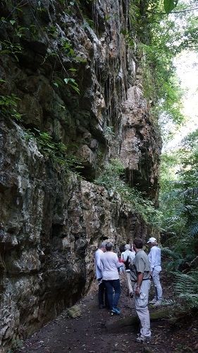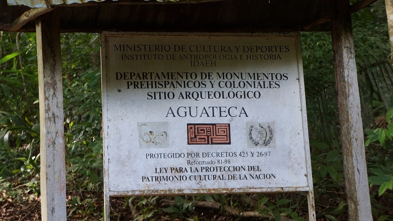 Nach dem Bezug unserer zugeteilten Hütten starten wir zum Ausflug zur Mayasiedlung Aguatecá. Mit dem Langboot fahren wir über den See und den Arroyo Petexbatún zu einer Landestelle. Hier kündigen alte, verblichene und teilweise zerstörte Hinweistafeln an, dass sich hier in der Nähe die archäologische Mayastätte Aguatecá befindet. Über eine mit halb verfaulten Brettern, zum Teil notdürftig geflickt, und unregelmässig hohen Stufen gelangen wir zum Eingangsgebäude, dessen Dach ganz fehlt, dessen Fensterscheiben weitgehend zerstört sind und dessen Mobiliar mir Ausnahme eines halb verfaulten Stehpultes inexistent ist. Immerhin ist ein Museumswächter da, der seinen Dienst hier weit abgeschieden von jeglicher Zivilisation wahrnimmt. René erklärt uns anhand eines Übersichtsplans die Anlage und die geschichtlichen Hintergründe. Dann machen wir uns auf den Rundgang, der zuerst am Fuss einer rund 50 m hohen Kalkwand entlang durch dichten Wald führt. Der Weg ist mit glitschigen feuchten Steinen übersät und Baumwurzeln überqueren ihn in alle Richtungen. Wir gelangen zu einem Unterstand, einem Aussichtspunkt hoch über dem See und der Ebene. Nach einem weiteren Aufstieg teilen wir uns in zwei Gruppen auf. Die eine nimmt den etwas einfacher angelegten Pfad zum Wohnsitz des damals hier herrschenden Mayafürsten. Zu sechst steigen wir in einen bis zu dreissig Meter hohen, engen Canyon hinunter und gehen einige hundert Meter der Sohle entlang bis zum Aufstieg, der uns wieder zur anderen Gruppe zurückführt. Und natürlich begegnen wir wiederum den Brüllaffen, deren lauthalse Proteste uns schon die ganze Zeit aus der Ferne begleiteten. Wir treffen nach kurzer Zeit unsere Gefährten, und René gibt uns die Erklärungen zu den hier stehenden Ruinen, die bis zur Zeit des Niedergangs der Mayakultur im 9. Jahrhundert bewohnt und dann als Folge feindlicher Angriffe verlassen wurden.