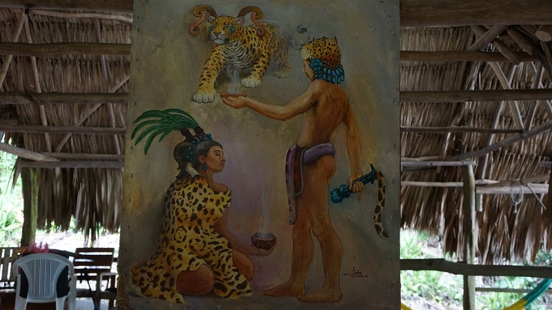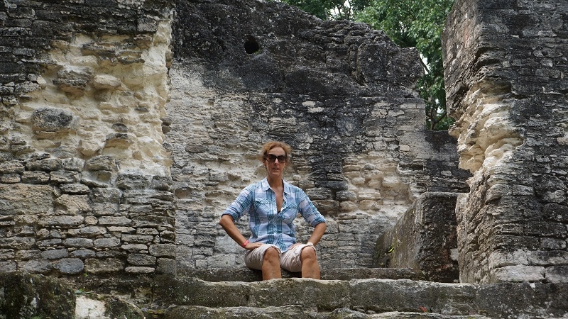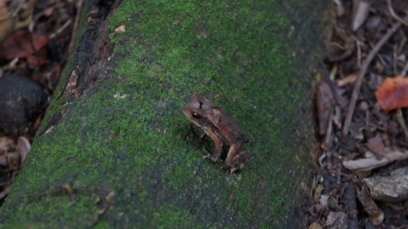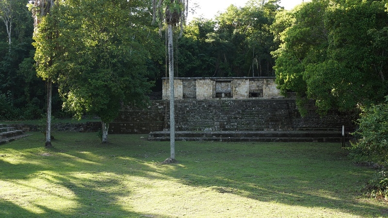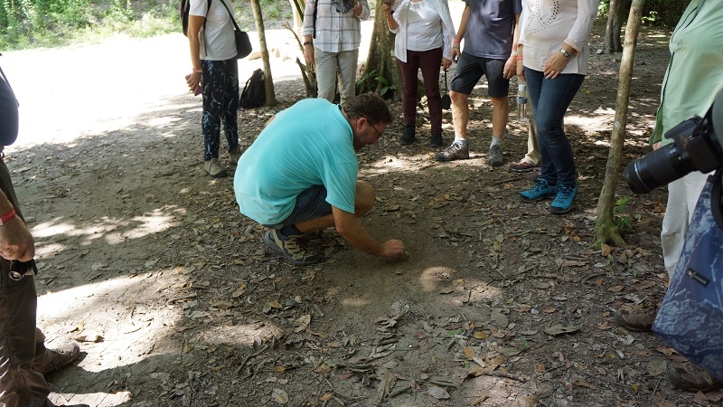 Margrit und und ich unternehmen bei Sonnenaufgang eine Entdeckungstour im Gelände der Lodge. Wir entdecken einen kleinen Frosch, der ähnlich aussieht wie ein Grasfrosch, sowie ein eichhörnchenähnliches Tier am Fusse eines Baumes. Bei einer Weggabelung steht ein Wegweiser, der zur Akropolis führt. Wir folgen ihm und erkennen auf einem Hügel eine Lichtung. Und da steht wiederum ein Wegweiser, der den Weg zum Ballspielplatz der Mayas führt. Dort sind noch zwei parallel verlaufene Wälle sichtbar. Ein weiterer Wegweiser führt uns zu einer Mauer und einem Kanal. Da scheint der Weg am Ende zu sein. Begleitet werden wir vom Fauchen und Knurren der Brüllaffen und vielen anderen Tönen und Geräuschen.