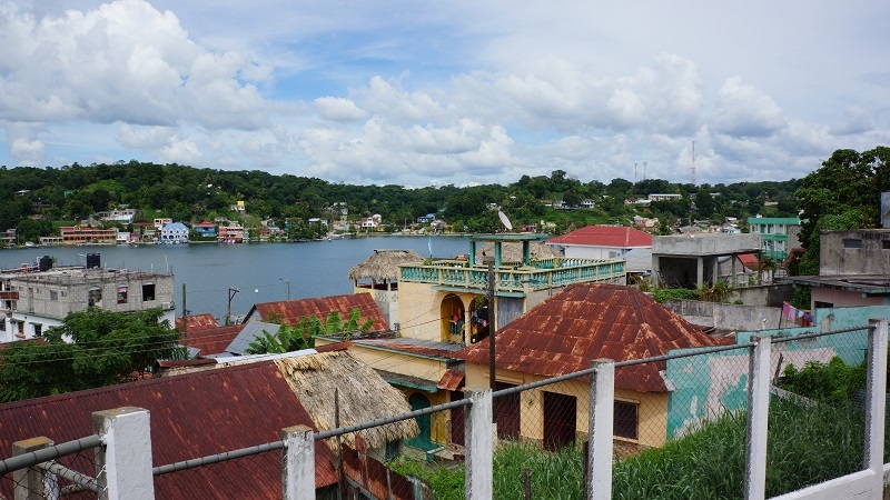 Die Bootsfahrt zurück zum Rio de la Passion, wo unser Bus uns erwartet verläuft ohne spezielle Höhepunkte. Mit dem Bus fahren wir nach Flores, wo wir uns etwas die Füsse vertreten und etwas essen können. Das Städtchen liegt auf einer Insel des Lago Petén Itza, die über einen Damm und über eine Brücke mit dem Festland verbunden ist, Enge Gässchen führen durch das Städtchen. Die Häuser sind verschiedenfarbig gestrichen. Auf der höchsten Erhebung befindet sich ein Kleiner Park und die Kirche. Eine Strasse führt dem Wasser entlang rund um die Insel. Sie steht aber zurzeit zum Teil unter Wasser, da jetzt, am Ende der Regenzeit, der Seespiegel sehr hoch steht.