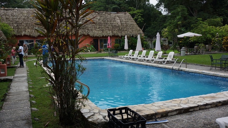 Anschliessend führt die Fahrt weiter nach Tikal, wo unser Hotel für die nächste Nacht steht. Schon kurz nach unserer Ankunft können wir die Zimmer beziehen und uns im Pool abkühlen. Ein Platzregen kühlt dann auch die Luft ab, so dass der von Beatrice gespendete Cuba Libre bereits wieder nötig wird, uns geht nervlich zu wärmen. Um halb sechs gibt es Strom, warmes Wasser und Internet, und ab jetzt sind alle anderweitig beschäftigt. Ein leckeres Abendessen im Hotelrestaurant rundet den Tag ab. Um halb zehn werden die Annehmlichkeiten unserer Zivilisation wieder abgeschaltet. So bleibt nicht viel anderes übrig als schlafen zu gehen und sich auf den Morgen zu freuen, denn um halb sieben wird alles wieder eingeschaltet. Jetzt ist es so weit: Ich kann meinen Text hochladen.
