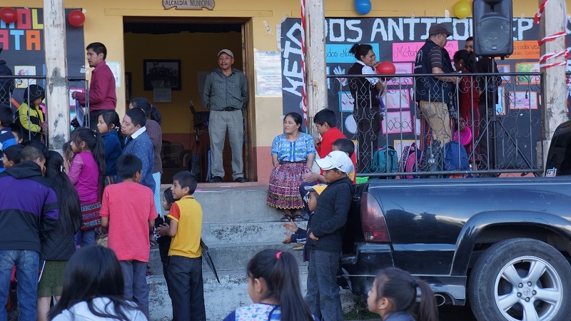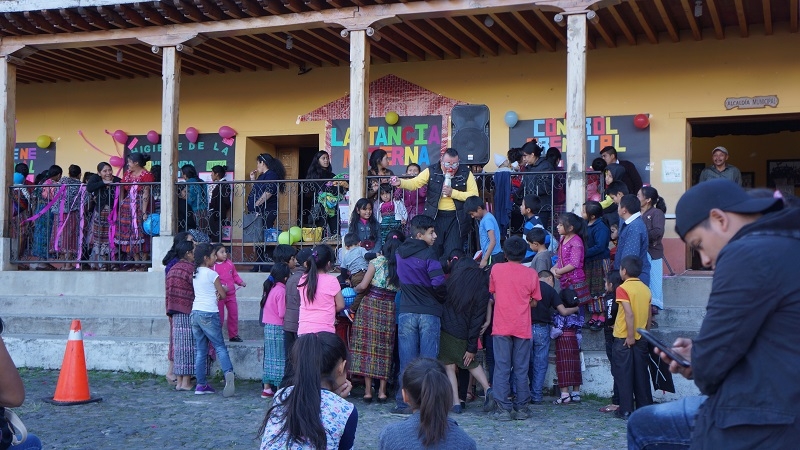 Dort gibt es eine besondere Kirchenfront. René gibt uns das Rätsel auf, vier Jaguare darauf zu erkennen, was den gefitzteren Reiseteilnehmern leicht fällt, mir aber gewaltig Mühe bereitet. Zudem werde wir hier Zeugen einer Gesundheits-Präventionsveranstaltung. Mit lauter Musik und Zaubertricks gibt ein Clown den zuschauenden Kindern Tipps zur Gesundheit. Aufgestellte Plakatwände vertiefen die Darbietungen des Clowns.