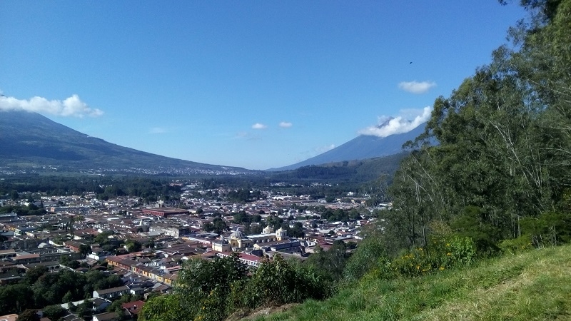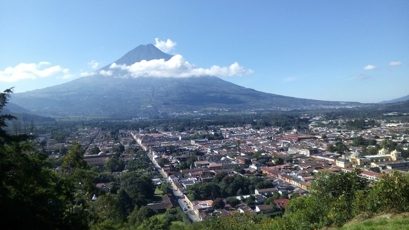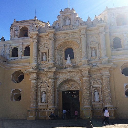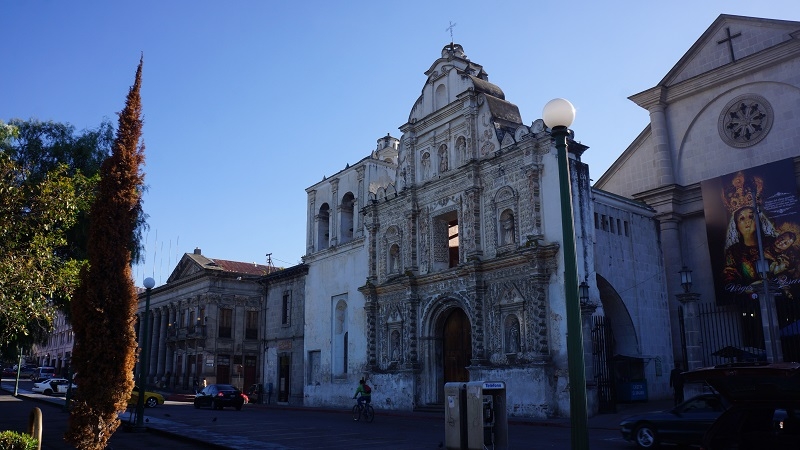 So marschieren wir gemeinsam los und finden den Weg problemlos zum Aussichtspunkt mit dem Kreuz. Unterwegs und oben haben wir eine prächtige Aussicht auf die Stadt hinunter, auf den inaktiven Vulkan Agua, und wir können mehrere Eruptionen mit Rauchausstoss auf dem Vulkan Fuego beobachten. Leider müssen wir denselben Weg in die Stadt zurück nehmen. Einen kurzen Halt legen wir bei der Kirche La Merced ein, aussen sehr hübsch aussehend, im Innern sehr nüchtern.