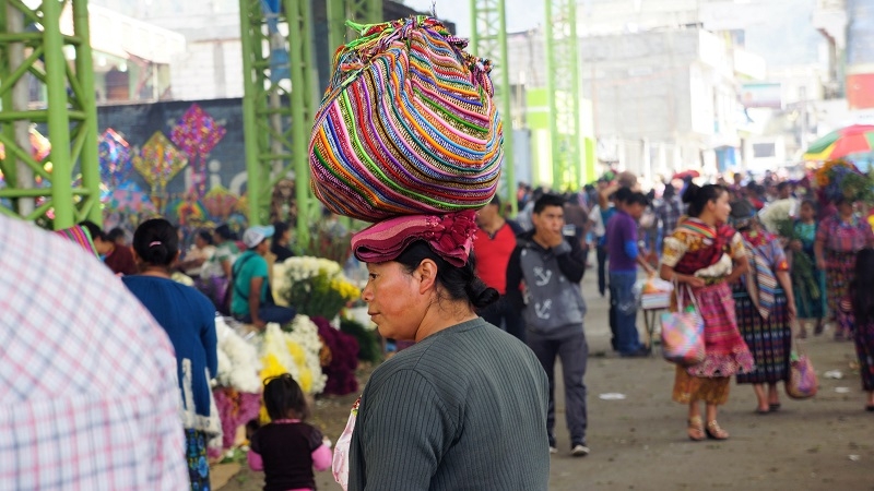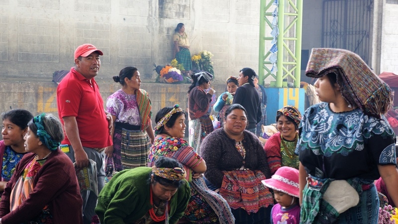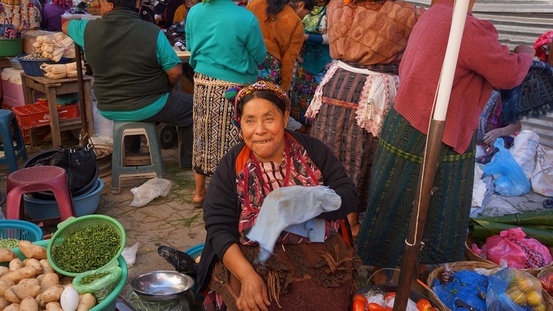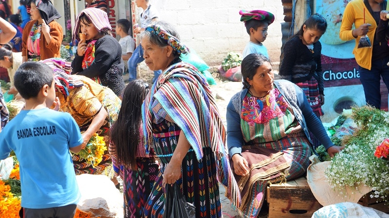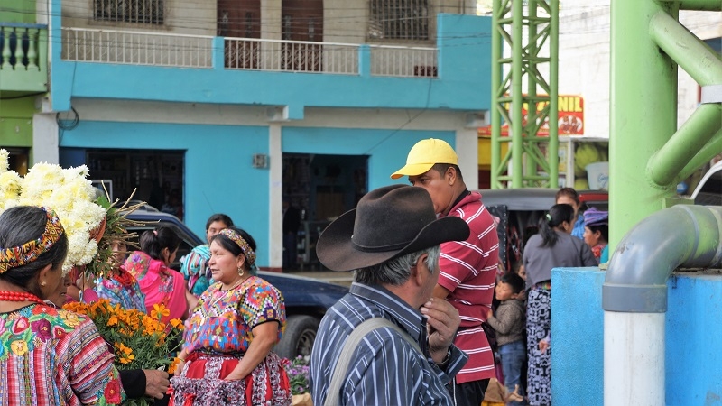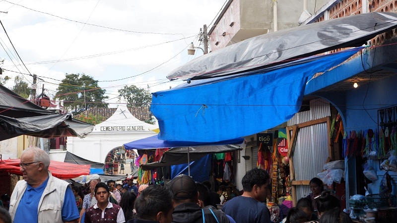Schon während des Frühstücks werden unsere Koffer in den Bus verladen. Die Reise führt uns nach Almolonga auf den Markt. Im Gewirr der praktisch nur einheimischen Marktbesucher lassen wir uns durch die Marktstände mit verschiedensten Gemüsen und Früchten treiben. Auf Allerheiligen sind ganz verschiedene Blumen, speziell auch Chrysanthemen, aktuelle Handelsware. Aber auch andere Güter wie Fleisch, Fische, Eier usw. werden angeboten. Die Einheimischen sind sehr kleine Leute, oft zwei und mehr Köpfe kürzer als wir. Die Frauen tragen bunte Trachten, tragen oft schwere Lasten auf dem Kopf, und wenn sie nichts tragen, haben sie ein buntes, zusammengelegtes Tuch drauf. Da ist wirklich viel los. In den Strassen neben dem Markt herrscht ein gewaltiges Verkehrschaos, denn da werden die oft en gros gekauften Waren auf Pickups und kleine Laster verladen, um sie an ihre Bestimmungsorte zu bringen. Wir kaufen uns ein paar süsse Bananen und Avocados und erfreuen uns am farbenprächtigen und geschäftigen Treiben.