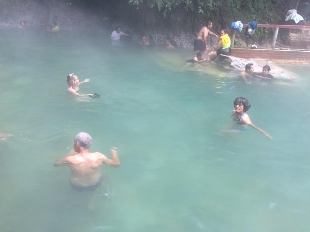 Als nächstes besuchen wir über eine schmale und kurvenreiche Bergstrasse das Thermalbad Fuentes Georginas und lassen es uns im warmen Schwefelwasser wohl sein. Da hier dichter Nebel herrscht und das heisse Wasser zusätzliche Dampfwolken erzeugt, herrscht eine mystische Stimmung. Im Restaurant geniesse ich eine schwarze Bohnensuppe (Sopa de frijoles). Sie schmeckt mir.