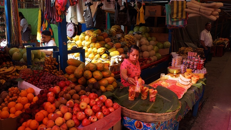 Für den Marktbesuch setzen wir am meisten Zeit ein. Zuerst ist der Handwerkermarkt an der Reihe, wo Margrit ein wunderschönes, handgewobenes Tischtuch kauft. Liselotte findet für ihren Sepp einen passenden Jadeanhänger. Im kommunalen Markt werden vorwiegend Esswaren, aber auch Gebrauchsgegenstände angeboten. In den engen Gassen wimmelt es nur so von Leuten. Oft scheint mir, dass mehr Leute etwas zu verkaufen haben, als Käufer vorhanden sind. Liselotte findet verschiedene Gewürze, von denen sie kleine Mengen kauft, Margrit erwirbt zwei rote Bananen. Aber mein Wunsch nach Macapulver lässt sich nicht erfüllen. Zum Abschluss reicht dann die Zeit doch noch, den letzten Cuba Libre in Guatemala zu geniessen, bevor wir ins Hotel zurückkehren, um auszuchecken und uns für die Fahrt zum Flughafen bereit zu machen.