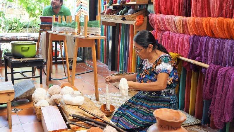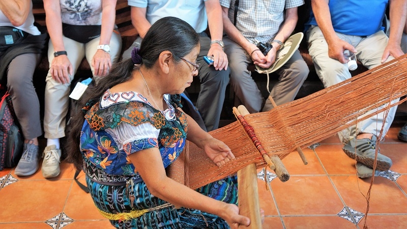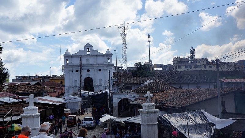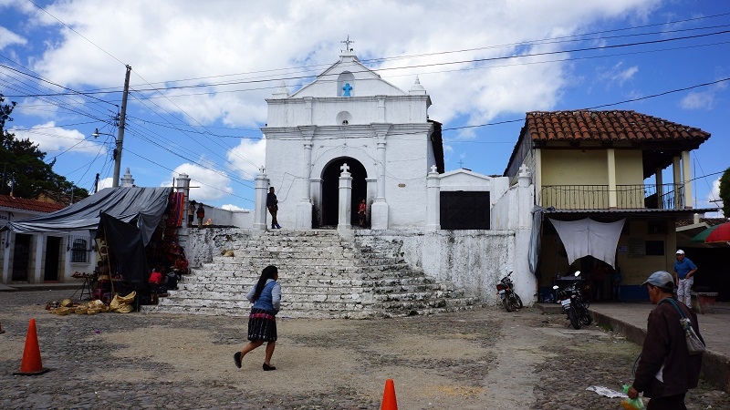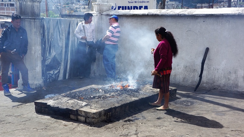 Heute steht uns ein gemütlicher Tag bevor. Um halb neun starten wir mit dem Programm. Gemeinsam gehen wir durch den Markt, besuchen die Thomaskirche, wo uns René fachkundig erklärt, wie die Spanier bei und nach der Eroberung der Urbevölkerung wirkten und wie sie das Christentum unter den Indigenas verbreiteten. Gegenüber steht eine Kalvarien-Kapelle, vor der gerade eine Zeremonie, ein Opfer stattfindet, bei der eine Frau das Feuer auf einem Altar mit verschiedenen Flüssigkeiten besprüht und beschwörende Worte spricht. Übrigens wurde das Buch Popol Vuh, das heilige Buch der Mayas in dieser Stadt gefunden und übersetzt.