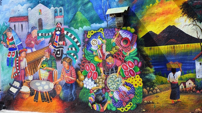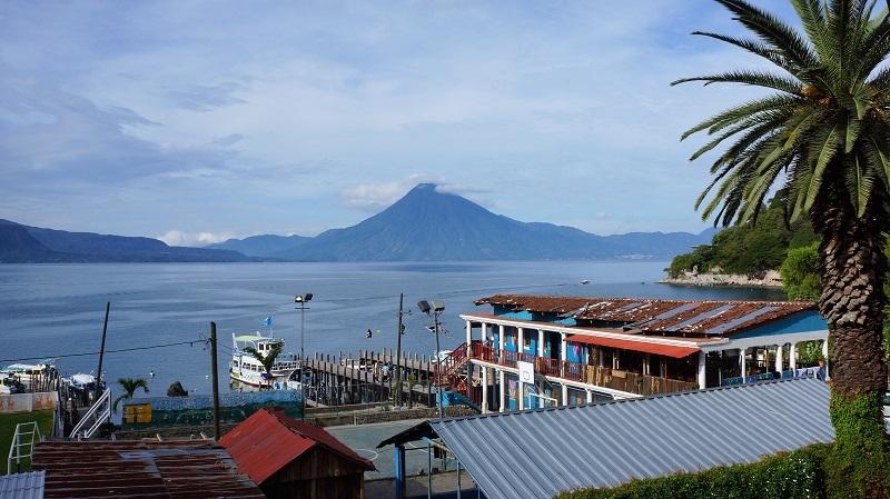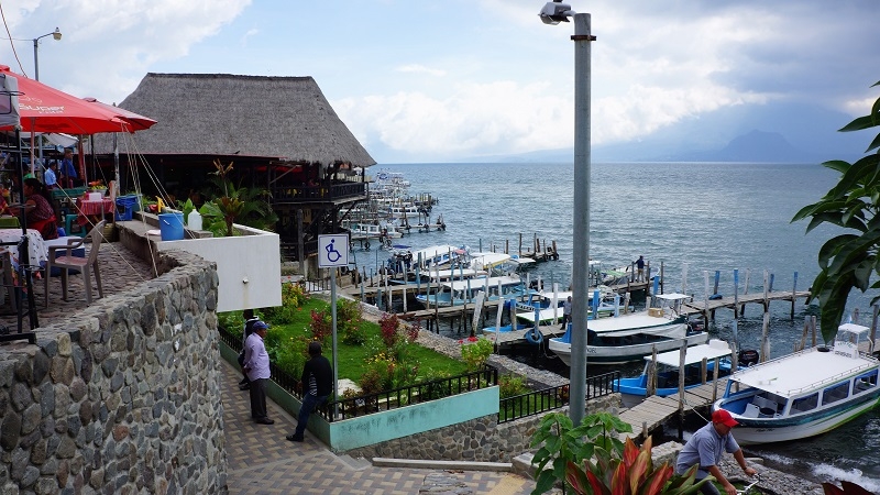 Beim nächsten Halt in Panajachel am Atitlán-See geniessen wir freien Ausgang. Wir essen dort zuerst auf einer Seeterrasse etwas Kleines und erkunden dann die ganze Seeuferpromenade. Es windet ziemlich stark, der Wellengang ist als Folge davon entsprechend. Der Strasse zum Ortszentrum entlang gelangen wir gemächlich durch die vielen Souvenirstände zu unserem abgemachten Treffpunkt. Hier triff dann auch David, der Bekannte von Beatrice und Guide des morgigen Tages ein. Er überrascht uns alle mit einem Kugelschreiber mit einem bunten, textilen Überzug, auf dem unsere Namen zu lesen sind.