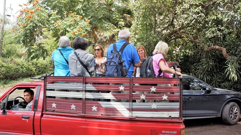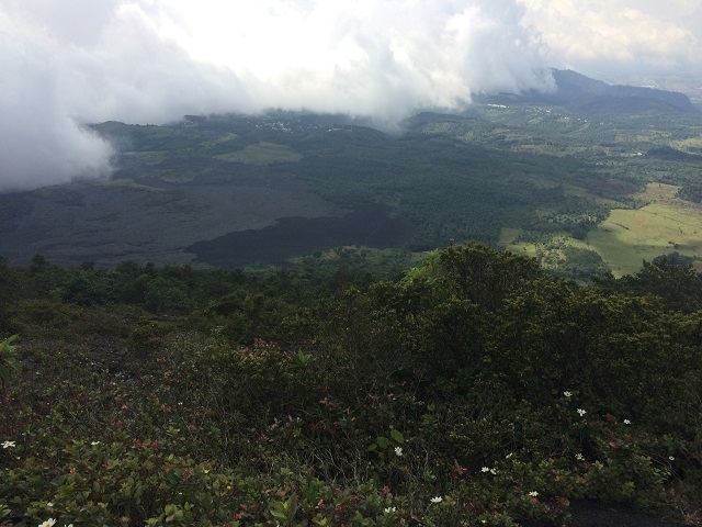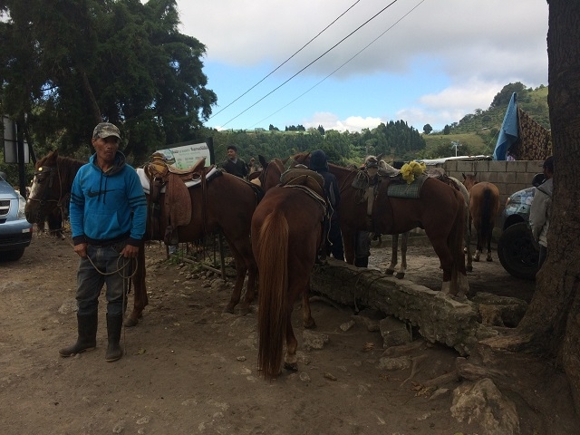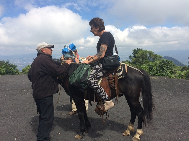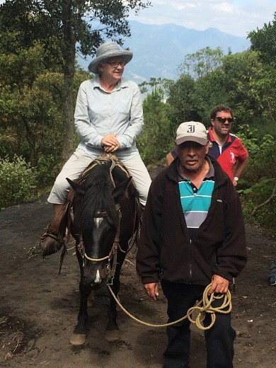 Nach dem Frühstück stehen wir zu elft um acht Uhr bei der Rezeption bereit für eine Bergtour. Mit dem Bus fahren wir in fünf Viertelstunden nach San Francisco de Sales, wo uns Stecken und Pferde angeboten werden, um hinauf zum Lavakegel zu wandern. Ein obligatorischer Guide begleitet uns. Auf einem recht steil angelegten Waldpfad mit vielen interessanten Pflanzen steigen wir auf zum Fusse des Lavakegels. Unterwegs macht uns unser Guide immer wieder auf Besonderheiten aufmerksam. Begleitet werden wir in der ersten Phase von mehreren Jungs und Männern mit gesattelten Pferden. Immer wieder bestürmen Sie uns, doch ihr Angebot, in den Sattel auf ihr Pferd zu steigen, anzunehmen. Sie glauben offenbar nicht so recht daran, dass wir diese Wanderung schaffen. Einer schafft es dann doch, und abwechslungsweise sitzt nu jeweils eine unserer Teilnehmerinnen auf dem Pferd. Die anderen Pferdeknechte mit ihren Tieren geben auf.