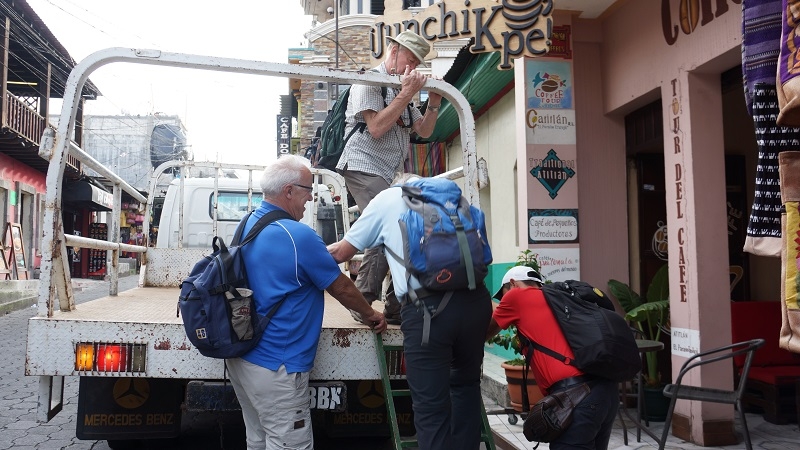 Auf einem grösseren Pickup, worauf wir alle Platz finden, fahren wir zu unserem Gaudi und zum Gaudi einiger Einheimischer zurück ins Städtchen, wo uns Beatrice zum Capuccino in ein Café einlädt. Der Mann hinter dem Tresen, ein 18-jähriger, kleiner, gedrungener Indigena ist ein wahrer Künstler in der Herstellung von Milchschaumbildern auf der Oberfläche der Cappuccinos. Mit verschiedenen Milchkrügchen, einer Schokoladencouvertüre-Tüte, Cacaopulver, einem Holzstäbchen und viel Geschick zaubert er Palmen, Herzen, Vögel, Gesichter, Spinnennetze und geometrische Figuren in die Tassen, einfach genial. Und zudem schmeckt der Kaffee ausgezeichnet.