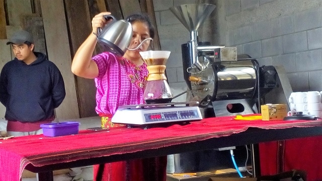 Die Fahrt führt uns nun zum Hotel in Quetzaltenango. Hier führt uns René zuerst in den Palacio Municipal mit einem wunderschönen Sitzungssaal, wo von alle guatemaltekischen Präsidenten ein Portraitbild hängt und von den offiziellen Besuchern die Staatsflagge aufgestellt ist. Zum Abschluss besuchen wir einen Familienbetrieb, ein Café, wo heisse Schokolade in verschiedenen Variationen angeboten wird. Ich verlange eine Variante, die hier unbekannt ist, aber in den Pistenrestaurants in Österreich angeboten wird, einen Lumumba. Prompt wird nach längerem Warten Die österreichische Version serviert. Und sie schmeckt u.a. auch unserem Mitreisenden Sepp. Ob sie hier in Zukunft ins Angebot aufgenommen wird, ist noch hängig. Neben geschlagener Nidel gehört ein Schuss Rum hinein.