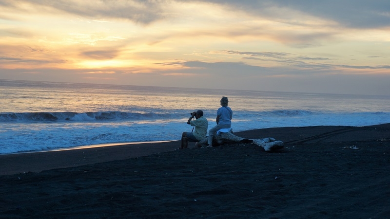 Nach dem Morgenessen unternehme ich mit Margrit eine längere Strandwanderung Richtung Westen. Die Schuhe in den Händen, den Feldstecher umgehängt, marschieren wir los. Der schwarze Sand ist dort, wo er der Sonne ausgesetzt ist, glühend heiss. Die am Strand auslaufenden Wellen kühlen die Füsse angenehm. Ein Bad im Pool trägt zum Wohlbefinden bei. Bis am Abend hier am Pool liegen ist gar nicht meine Sache. Mein Vorschlag, nach Monterrico zu gehen stösst bei Margrit auf taube Ohren. So beschliesse ich nach Absprache mit Beatrice allein den Weg unter die Füsse zu nehmen.