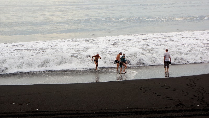 So erreichen wir schon bald einmal unser Domizil für die kommenden zwei Nächte, die Hotelanlage Utz Tzaba Beach, wo der Swimmig Pool zum kühlenden Bade einlädt. Der nächste Gang führt zum Pazifikstrand, wo schwarzer Sand liegt und sich die Wellen donnernd zehn Meter weiter draussen brechen. Vor dem Baden darin werden wir gewarnt, da eine kräftige Strömung aufs Meer hinaus wirkt. Ein Cuba Libre für alle Reiseteilnehmer, gespendet von Christa, hält uns davon ab, das Bad im Pazifik zu wagen.