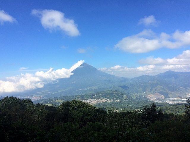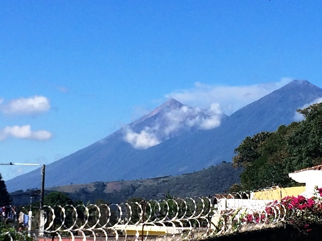 Ein strahlend blauer Himmel begrüsst uns heute Morgen. Nach der Morgentoilette packen wir gleich unsere Koffer und stellen sie vor das Zimmer hinaus. Das Frühstück haben wir schon gestern Abend bestellt, damit wir das Essen rechtzeitig auf den Tisch bekommen. Gleich nach dem Essen fahren wir ab, zurück auf der Küstenstrasse bis Puerto Quetzal und dann auf der Autobahn Richtung Haupstadt. Schon bald erkennen wir am Horizont die drei Vulkane Fuego, Agua und Pacaya. Der Fuego stösst von Zeit zu Zeit eine Rauchwolke aus.