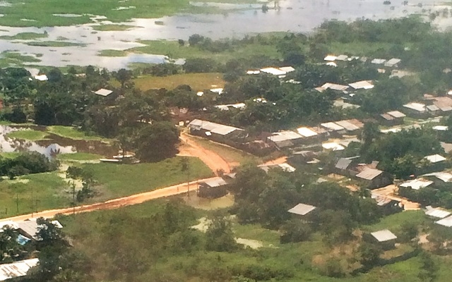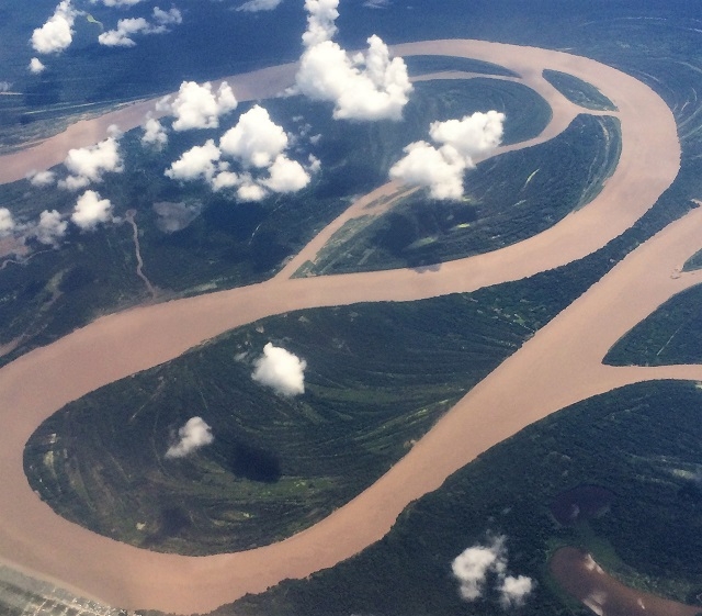 Währen des ebenfalls kurzen Weiterflugs nach Iquitos bewundern wir das dünn besiedelte Regenwaldgebiet am Ucayali- und Marañon-Fluss. Sowohl beim Aufstieg als auch beim Landeanflug lassen sich die hohen Baumwipfel, die für die Landwirtschaft kahl geschlagenen sowie die verlassenen, neu überwucherten Flächen erkennen. Dazwischen liegen grössere und kleinere Wasserflächen und die mäandrierenden Flussläufe. Während vor allem die fliessenden Gewässer hellbraune Farbtöne aufweisen, hervorgerufen von den gewaltigen Mengen an Schwebstoffen, sind stehende Gewässer von dunkler, blau-grau und grüner Tönung. Dazwischen liegen Einzelgebäude und Siedlungen der einfachsten Bauart.
