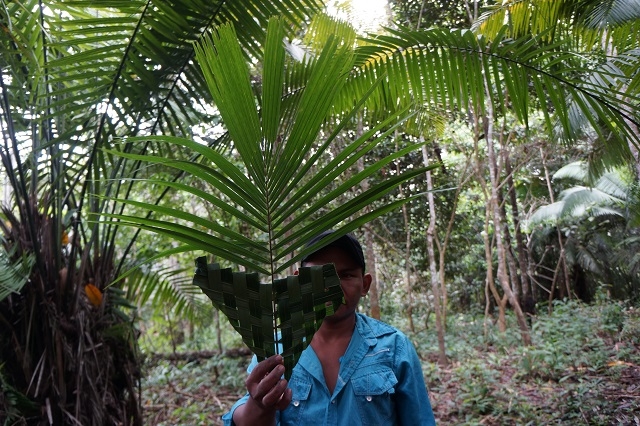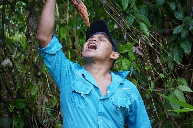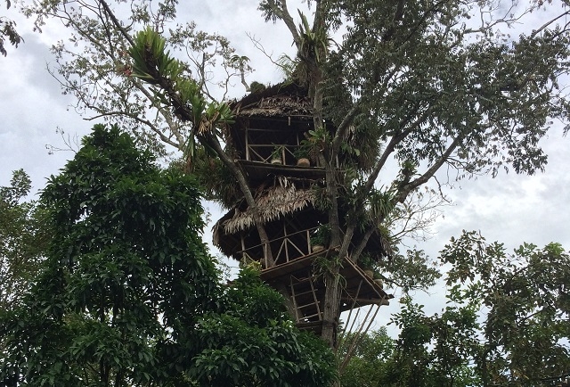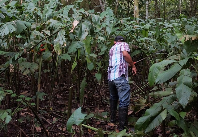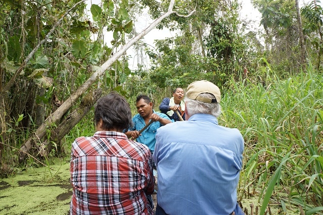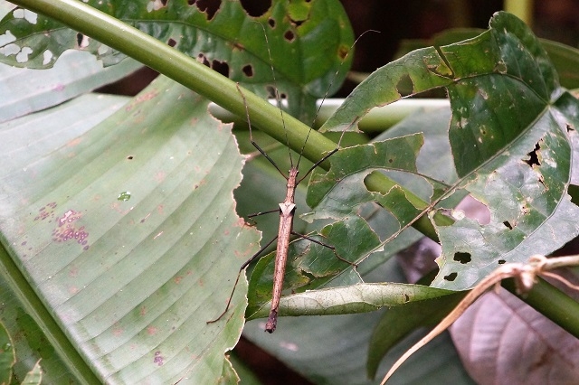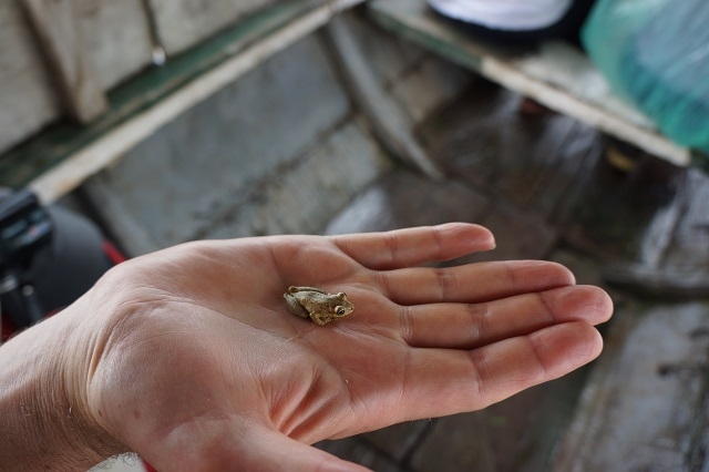 Um halb sechs stehen wir auf und machen uns für die Frühexkursion bereit. Edwin ist bereits am Machete-Schleifen. Wir sprühen unsere Kleider ordentlich mit Mückenmittel ein. Für die Haut verwenden wir ein einheimisches Mittel. Im frühmorgendlichen Dschungel lassen sich von allen Seiten die verschiedensten Töne und Geräusche hören. Da klopft zum Beispiel ein Specht energisch auf Holz, hoch in den Bäumen zetern die Papageien, aus dem Sumpf gluckst es immer wieder, Zikaden und Heuschrecken zirpen in allen Stimmlagen, Edwin ahmt Vogel- und Affenlaute nach, um die Tiere anzulocken. Aber das Glück ist uns nicht besonders hold. Auf einem Baum bewegt sich etwas. Edwin sagt: „Monkeys, eine nachtaktive Art.“. Auf einem anderen Baum bewegt sich ein Bushdog abwärts, Margrit findet mit dem Bestimmungsblatt heraus, dass es sich um ein Tyana handelt. Die vielen Blätter behindern die Sicht ungemein. Zudem hackt Edwin einen grossen Teil des Weges, den wir machen, mit der Machete aus dem Dickicht, vorwiegend wildwachsenden Ingwer, so dass die Tiere in der Nähe ohnehin verschwinden. Ein paar farbenprächtige Schmetterlinge zeigen sich dennoch, und auch die Pflanzenwelt ist spannend. Um acht sind wir zurück, es gibt Morgenessen.