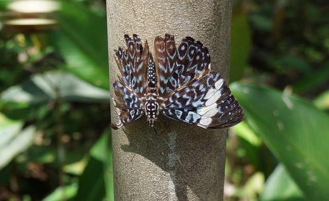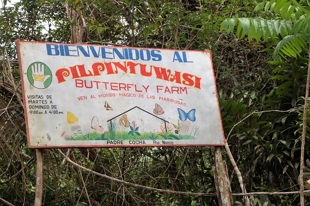 Als wir dort aussteigen, kommt gleich ein „alter Bekannter“ auf Beatrice zu und begrüsst sie ganz herzlich. Es ist Sandro, der ein Ausflugsboot besitzt. Mit ihm fahren wir auf dem Rio Nanay zur Schmetterlingsfarm Pilpintuwasi. Auf einem sumpfigen Weg, der mit einem Maschendrahtzaun in Tunnelform überdeckt ist, gelangen wir zum Kassenhäuschen, wo uns eine ältere englischsprachige Praktikantin empfängt und uns nach Einkassieren des Tickets durch den Park führt. Im mit feinmaschigen Netzen abgetrennten Bereich lebt eine riesige Anzahl verschiedenartiger Schmetterlinge. Wir foto- und videografieren, was uns vor die Kamera kommt. Wirklich prachtvolle Sommervögel, in unterschiedlicher Färbung und Grösse, gaukeln um uns herum und setzen sich auf die rundum auf Stäbe aufgesteckten Obststücke. Der von uns in der Hitze abgesonderte Schweiss auf unserer Haut zieht verschiedene Schmetterlinge an. Sie setzen sich auf unseren Kopf, aufs Gesicht und auf die Arme, fahren ihren Rüssel aus und tasten mit ihm unsere Haut ab. Ob es das Salz unseres Schweisses ist, das sie anlockt?