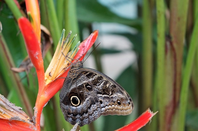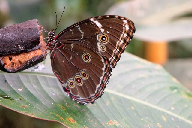 Anschliessend besuchen wir die „Puppenstube“, wo lauter Schmetterlingspuppen aufgereiht an Korkwänden hängen. Bei genauerem Hingucken erkennen wir, dass da und dort bereits Schmetterlinge ihre unansehnlichen Hüllen verlassen haben und nun ihre Flügel trocknen lassen.