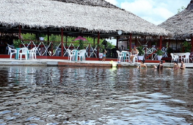 Danach gehen wir zum Boot zurück und lassen uns zum Restaurant Bufeo beim Zusammenfluss von Rio Nanay und Momón fahren. Es ist heiss, wir trinken einen Fruchtsaft und geniessen einen gemischten Salat dazu. Währenddessen suhlen sich ein paar Frauen unterschiedlichen Alters beim Steg im kühlen Wasser. Leider blieb meine Badehose im Hotel zurück, sonst hätte ich ihnen gerne Gesellschaft geleistet.