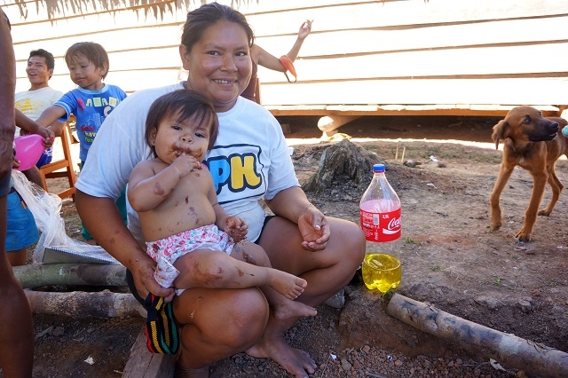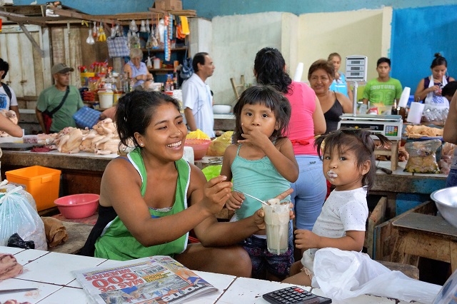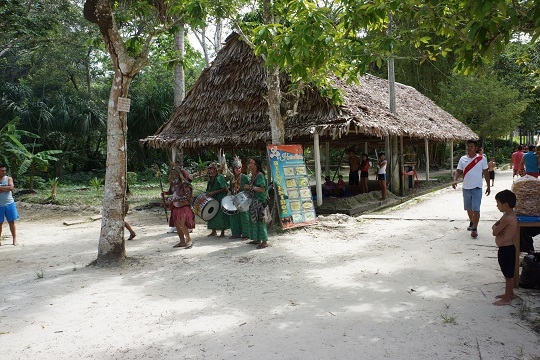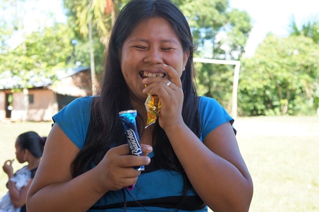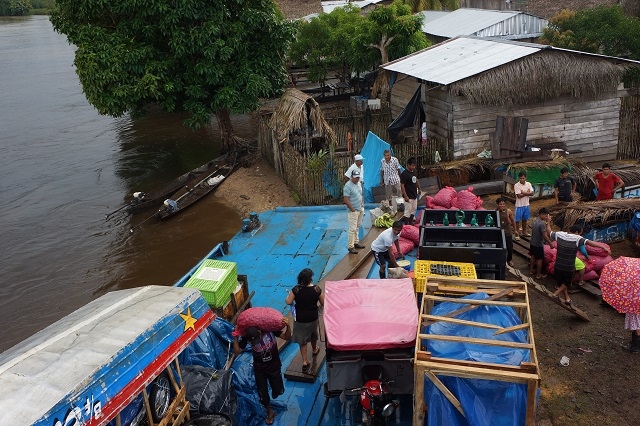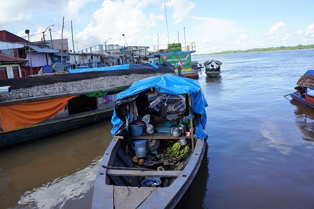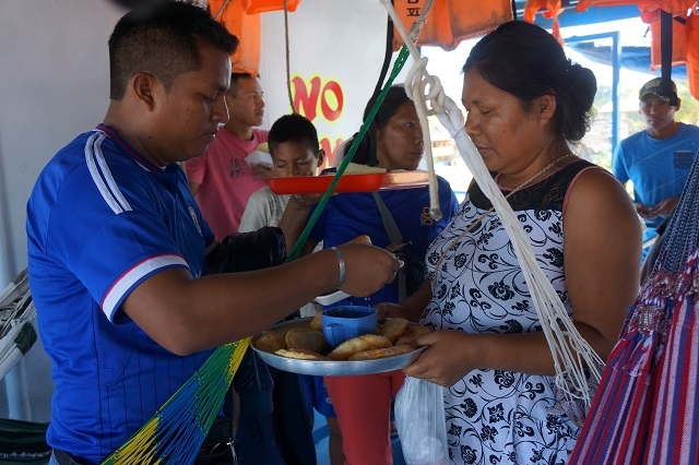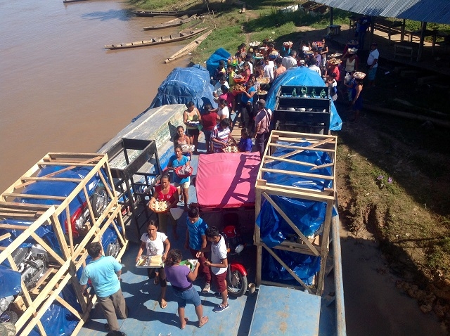 Beim einen Halt steigen rund zwanzig Frauen aus dem Dorf mit Tablaren, Körben und anderen Behältnissen ein. Darauf und darin sind Wegwerfteller mit frisch zubereiteten Fischen vom Grill, mit Reis, Kochbananen, Yucca und anderen Köstlichketen. Das Schiff fährt ohne diese Händlerinnen von Bord zu schicken, weg und hält ein paar hundert Meter weiter flussaufwärts, um sie nach erfolgreichem Geschäft wieder abzusetzen.