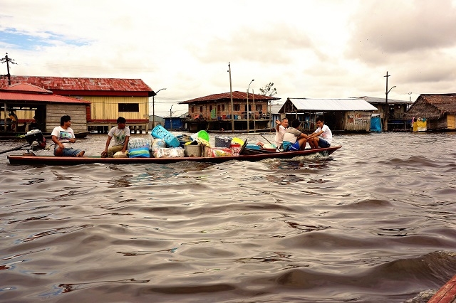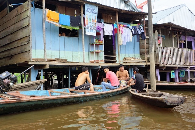 Kurz nach diesem Zusammentreffen, steigen wir zu einer Rundfahrt durch den schwimmenden Teil des Stadtviertels Belen in ein Boot. Da stehen viele Häuser im Wasser, weil es dieses Jahr überdurchschnittlich hoch steht. Überall hat man Stege erstellt, um den Bewohnern den Zugang zu ihren Häusern trockenen Fusses zu ermöglichen. Etwas weiter draussen, wo die Häuser über längere Zeit im Wasser stehen, sind sie entweder auf Stelzen oder auf Flossen gebaut. Wir fahren durch die Kanäle durch das Venedig Südamerikas. Allerdings ist da nichts vom Prunk vergangener Zeiten zu sehen. Die Häuschen sind mit wenigen Ausnahmen aus Holz gebaut und sehen zum grösseren Teil recht armselig aus.