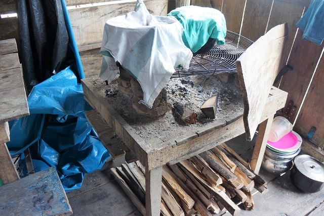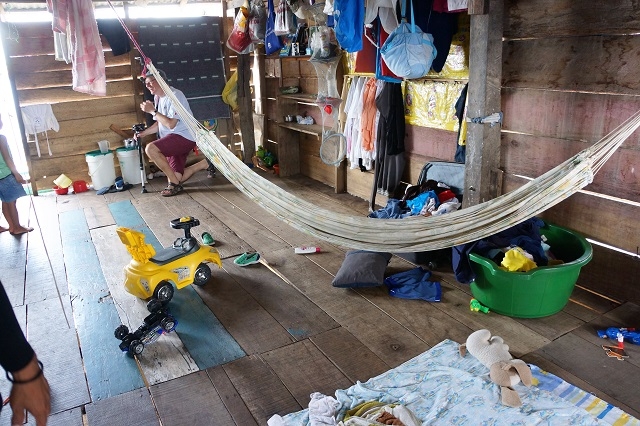 Unser Guide, Carlos, führt uns kurz vor Abschluss der Fahrt zu seinem Haus und zu seiner Familie in der schwimmenden Stadt. Das Boot legt auf der Hinterseite der Hütte an, und wir steigen auf das Floss, worauf die Behausung ca. einen Meter erhöht steht. Oben, in einer Lücke in der Wand, erscheint sein kleiner Sohn und guckt erwartungsvoll und scheu auf uns. Seine hübsche, sehr junge Frau zeigt sich ebenfalls mit ihrem älteren, ca. vierjährigen Buben. Das Betreten der aus einem einzigen Raum bestehenden Wohnung fällt uns nicht so einfach, denn es ist keine brauchbare Leiter vorhanden. Mit Hilfe eines Holzhockers und des Besitzers schaffen wir den Aufstieg. Wir luxusgewohnte Europäer stehen in der Wohnung einer einfachstens lebenden, jungen peruanischen Familie. Unmittelbar neben diesem Hintereingang steht die Kochstelle. Sie ist ein grob gezimmerter Holztisch mit einem vielleicht zehn Zentimeter über die Platte stehenden Rand. Darin liegt die Asche vom zuletzt entfachten Feuer. Um zu verhindern, dass der Herd selber zu brennen anfängt, wurde vorgängig Erde darauf verteilt. Möbelstücke fehlen, die Kleider sind an Nägeln aufgehängt, die an der einen Seite unter dem Hüttendach eingeschlagen wurden. Die Spielgeräte der Kinder sind auf dem Boden verstreut. An einer Wand steht ein Fernseher an erhöhter Stelle. Eine Hängematte ist an den Holzverstrebungen angebracht. Ich werde beim Filmen darauf aufmerksam gemacht, das ich auf dem „Bett“ der Eltern stünde, d.h. die Bewohner schlafen auf dem Boden. Das Ganze sieht wirklich armselig aus, und wir können einfach hoffen, dass Carlos den „Lohn“, den er von uns bekommt, zugunsten seiner Familie einsetzt.