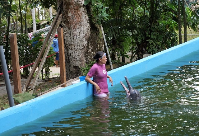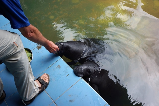 Der erste Stopp findet bei einer Aufzucht- und Pflegestation an der Strasse nach Nauta statt. Hier werden Seekühe, die mutterlos oder verletzt aufgefunden werden, aufgepäppelt und später wieder ausgesetzt. Seekühe sind urtümliche Tiere mit aussehensmässig sehr grosser Ähnlichkeit zu Robben, leben im Amazonasgebiet in Lagunen und ernähren sich von Pflanzen, und zwar sollen das 80-100 kg sein pro Tag. Sie sind stark gefährdet, da sie gejagt und die Jungtiere zwei Jahre gesäugt werden. So kommen viele Junge um, weil die Mutter getötet wird und sie dann die besonders eiweisshaltige und laktosefreie Milch nicht mehr erhalten. Wir dürfen da auch zwei Jungtiere füttern und bestaunen die spezielle Ausbildung des Mundes, der gleichsam Blätter an der Wasseroberfläche ansaugen kann und mit den seitlich ausgestülpten Lippen, die mit dicken Borsten ausgestattet sind, in den Schlund befördern. Schneidezähne besitzen sie keine. Die Betreiber dieser Station haben die Anlage so gestaltet, dass vor allem Kinder angesprochen werden, denn vor allem diese sollen für den Schutz dieser Tierart sensibilisiert werden. Zudem sind wie schon im Schmetterlingspark Pilpintuwasi eine stattliche Anzahl Gehege vorhanden, worin Tiere, vor allem Affen, gehalten werden, die aus illegaler Haltung stammen.