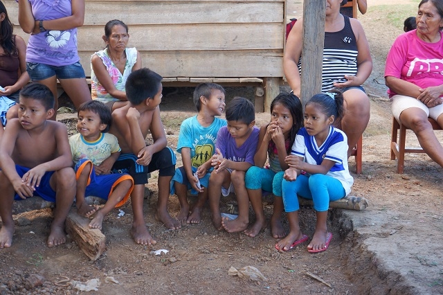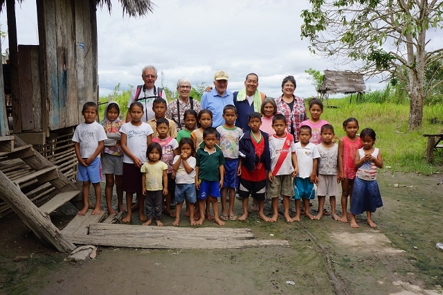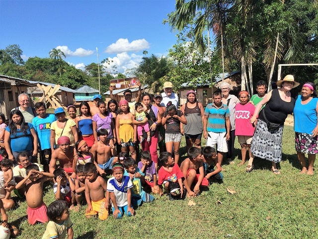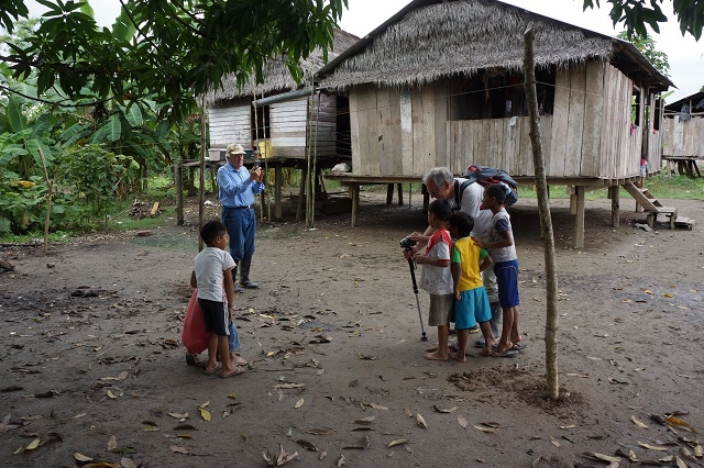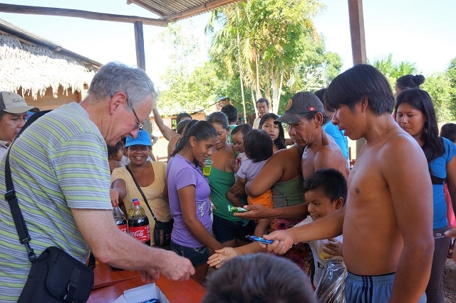 Der Nachmittag ist für den Besuch eines Yagua-Dorfes reserviert. Einer der ehemaligen Guias, Leo, selbst ein Yagua, hatte ihr von einem Dorf berichtet, das eine eigene Schule bauen und gerne unterstützt werden möchte, da die Ressourcen fehlen. Sie informierte uns bereits vor der Reise, dass sie da einsteigen möchte. Urs und wir sagten ihr eine Beteiligung zu, und so organisierte sie im Voraus zusammen mit Leo einen Besuch im Dorf, wobei den Kindern und den Dorfbewohnern Schulmaterial überreicht werden soll. Leo kaufte darauf zusammen mit seiner Frau einiges an nützlichen Dingen ein, stellte Lehrer- und Schülerpakete zusammen und brachte die Sachen vorgängig ins Dorf. Und heute fahren wir nun mit dem Boot zum Dorf. Ausserordentlich herzlich werden wir da begrüsst und zum Platz geleitet, wo der Aushub und das Grundgerüst für das geplante Schulhaus bereit sind. Der Dorfvorsteher, Leo und Beatrice richten an die Dorfbevölkerung und insbesondere an die Kinder einige Worte. Darauf werden die Geschenke verteilt und verdankt. Grossen Anklang findet die Verteilung von Schoko-Branches. Manches Kindergesicht bekommt braune Flecken ab, und auch den Erwachsenen schmecken sie offensichtlich. Was auch immer gut ankommt, sind Fussbälle. Schon sehr bald haben sich zwei Kindermannschaften gebildet, und da ich als einziger sichtbar an meinem Arm eine Uhr trage, werde ich beauftragt, die Zeit für das Match zu stoppen. Die Erwachsenen freuen sich am Fotoalbum, das ihnen Beatrice vom Chocolatata- Fest im letzten Jahr mitgebracht hat. Für einige von ihnen ist es das erste Mal, dass sie sich selber auf einem Foto sehen können. Zum Abschluss werden alle nochmals zusammengerufen für ein Gesamtbild mit vielen strahlenden Gesichtern.