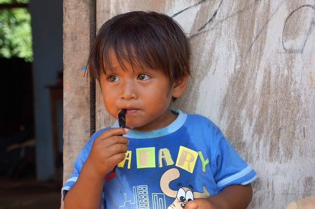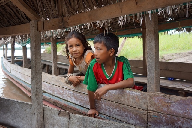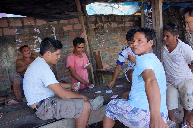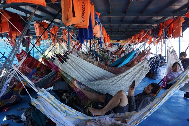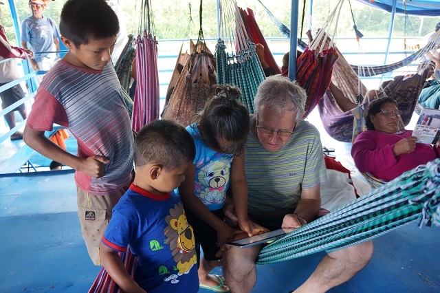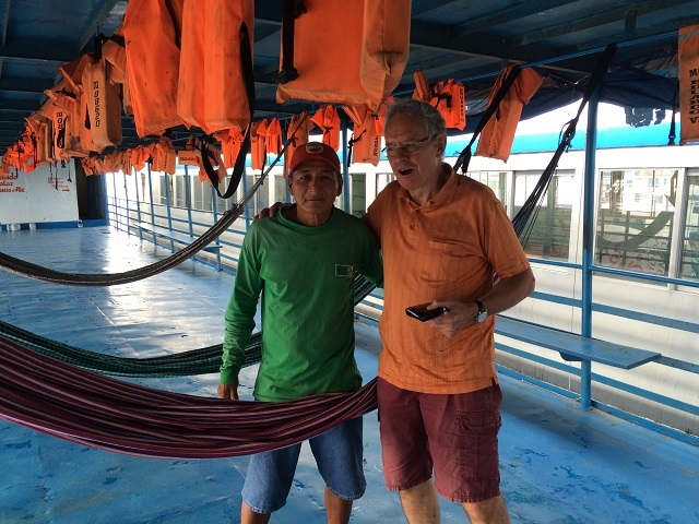 Man kommt mit den Leuten in Kontakt. Ein junges französisches Paar belegt die Kabine neben uns. Der Mann stammt aus Paris, die Frau aus der Normandie. Sie sind schon zwei Jahre unterwegs und wollen noch weitere zwei bis drei Monate anhängen. Neben unserer hängt die Matte einer jungen Frau mit zwei Kindern. Das Mädchen hat heute Vormittag schon Margrits Frühstück bekommen. Gerne kommt es immer wieder in unsere Nähe und interessiert sich für mein i-Pad. Ich mache ein Foto und zeige es ihm. Da staunt es aber. Ein Lehrer aus Iquitos ist mit zwei seiner Schüler unterwegs. Er spricht ein paar wenige Brocken Englisch und möchte wissen, woher wir sind. Von der Schweiz weiss er zwei Sachen: Die Schweizer sind reich und geschäftstüchtig, und die Alpen sind ein hohes Gebirge und liegen in der Schweiz. Ich mache ihn darauf aufmerksam, dass die Anden höher sind. Er bekommt Margrits Mittagessen, das er gerne entgegennimmt, so muss er nicht anstehen.