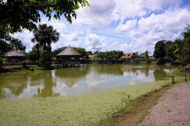 Nun geht die Fahrt weiter nach Nauta, wo wir die Sapi Sapi Lagune mit einer darauf hinausgebauten Plattform besuchen. Auf zwei künstlich angelegten Inseln sonnen sich mehrere Schildkröten. Die Sehenswürdigkeiten in dieser Lagune sind aber die darin lebenden Fische. Mit Brotstücken, die man ins Wasser wirft, lockt man sie an. Sehr schnell schnappen sie nach den schwimmenden Brocken und zeigen sich an und teilweise über der Oberfläche. Es sind drei Arten: der Paiche oder Arapaima von dunkelgrauer Farbe mit leuchtend orangefarbenen Streifen im Schwanzbereich, der Monkeyfish oder Arowana von hellgrauer Farbe mit gelblich getöntem Bauch und der Catfish, eine Welsart, von ganz dunkler Farbe mit grossem Maul und je grossen seitlichen Barten.