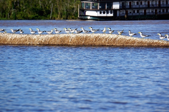 Danach führt uns Sandro noch zur Mündung des Rio Nanay in den Amazonas. Er meint, dass wir hier noch Amazonasdelfine sehen könnten. Zwar kann Margrit zwei Exemplare kurz beobachten, aber dann herrscht tote Hose. Wir können ein paar Seeschwalben zuschauen, wie sie Wassertiere jagen, indem sie spähend wenige Meter über der Oberfläche fliegen und sich dann urplötzlich fast senkrecht hinunter auf die Beute stürzen. Es sind sicher zwei verschiedene Arten, die hier jagen.