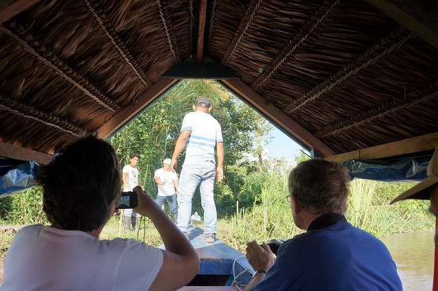 Als nächstes besteigen wir ein typisches Boot, recht lang, mit zwei seitlichen Bänken und einem Heckmotor mit Schraube, die sich am Ende einer langen Stange befindet, so dass sie je nach Wasserstand verschieden tief eingetaucht werden kann. Unser Gepäck, das wir im Van gelassen haben, ist bereits eingeladen. Es geht zuerst ein Stück flussabwärts auf dem Rio Marañon und dann den Ucayali hinauf. Treffsicher – für uns sieht das Ufer überall gleich aus – hält der Fahrer auf eine bestimmte Stelle am rechten Ufer zu. Da stehen bereits Pablo und ein weiterer Helfer, die uns in Empfang nehmen und an Land helfen. Wir ziehen die mitgebrachten Stiefel an und behängen uns mit unserem Gepäck.