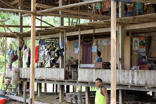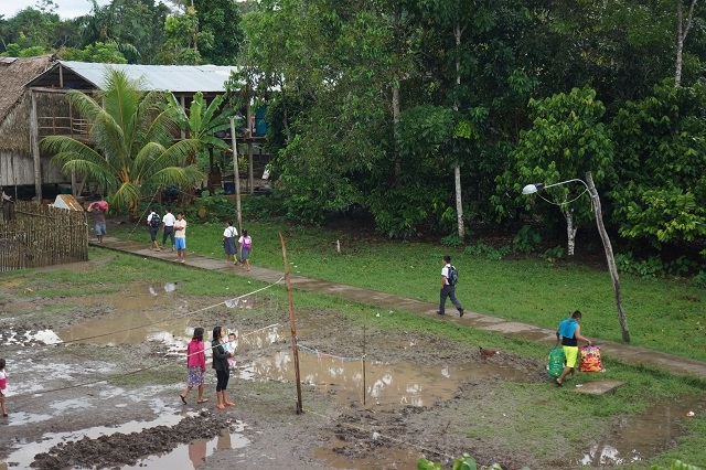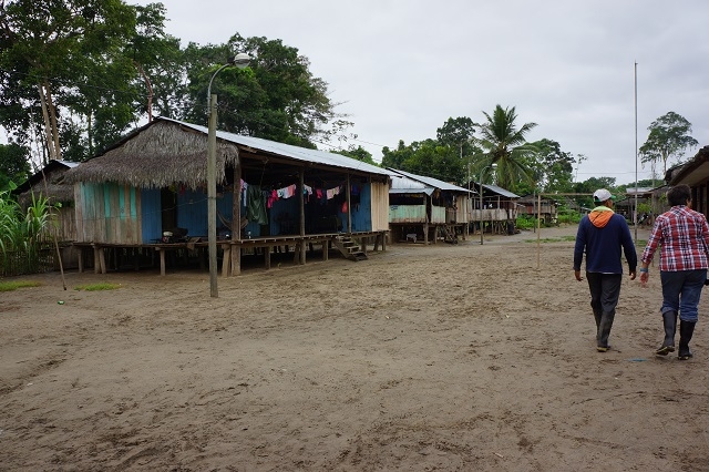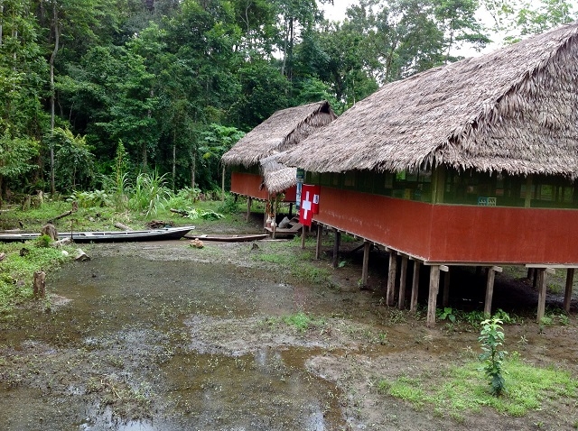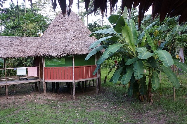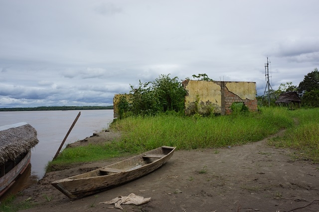 Um acht gibt es Frühstück, um neun starten wir zu einer Bootsexkursion ins Dorf Castilla, da unsere beiden Mitreisenden heute Mittag nach Iquitos zurückfahren und Beatrice sich dort noch verabschieden will. Für uns beide ist dieser Besuch spannend, da wir schon vor drei Jahren in diesem Dorf waren. Beatrice macht uns darauf aufmerksam, dass sie sehr enttäuscht sei über das Verhalten vor allem des Dorfchefs, der sich ihrer Meinung nach zu stark auf Staats- und andere Hilfen verlässt und zu wenig Eigeninitiative entwickelt. Ein Angebot für neue Wandtafeln für die Schule hat er vor zwei Jahren ausgeschlagen, weil der Staat sowieso eine neue Schule errichten wolle. Ca. hundert Meter entfernt von der alten Schule wurde dann aber von einer Beatrice unbekannten Institution eine gemauerte WC-Anlage gebaut. Und heute, als wir ans Ufer kommen, ist die Schule eine Ruine, vom Hochwasser führenden Ucayali zerstört, unmittelbar am Ufer gelegen. Die WC-Anlage steht noch, wird aber kaum genutzt. Viele Häuser fielen ebenfalls dem Hochwasser zum Opfer, ebenso die „Hauptstrasse“ und die Strassenbeleuchtung. Das Dorf sieht noch ärmlicher aus als vor drei Jahren.