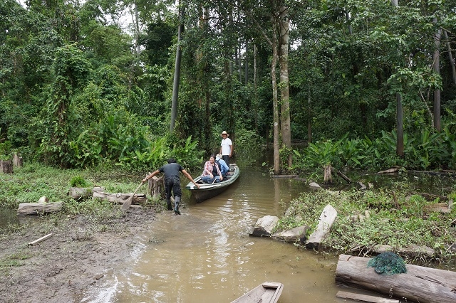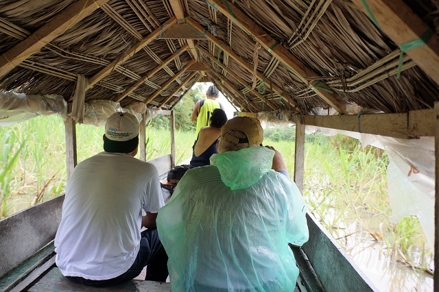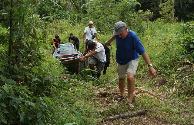 Danach duschen wir nochmals kalt, packen unsere Sachen und machen uns bereit für die Rückreise nach Iquitos. Nach der Übergabe einiger Geschenke und einem Abschiedsfoto vor der Lodge steigen wir mit allem Gepäck ins erste Boot, werden damit zum zweiten Boot mit Motor gefahren und tuckern damit durch den Wald, die Lagune und wieder durch den Wald zur nächsten Ausstiegsstelle. Nun legen wir gegen hundert Meter zu Fuss zurück, während die Lodgeangestellten das Boot zur nächsten Einstiegsstelle schleifen. Hier können wir wieder einsteigen, um nachher noch gegen zweihundert Meter zu Fuss zum Ufer des Ucayali zu gehen. Kurz vor elf sind wir da. Das eine Boot schleppen wir dann noch über Land zum Fluss, wassern es und nehmen es ins Schlepptau.