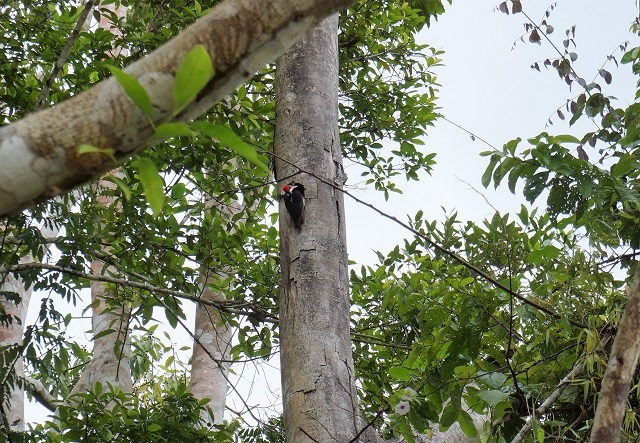 Nun geht die Fahrt Ucayali abwärts bis zum Amazonas und noch etwas weiter. Durch eine schmale Schneise im Uferbewuchs zweigt das Boot rechts ab und gelangt zum viel schmaleren und ruhiger fliessenden Rio Yarapo. Nun fahren wir wieder flussaufwärts. Wir schalten hie und da einen Halt ein, um Tiere und Pflanzen genauer zu beobachten. So sehen wir in den Baumkronen verschiedene Affen herumturnen, können einem Linienspecht vor seiner Nesthöhle und den Seeschwalben bei der Jagd zuschauen. Verschiedene Papageien und sogar einmal ein Trupp Jabirus (Storchenvögel) fliegt über uns hinweg. Wunderschön finden wir sie blau-weissen Schwalben, die in grösseren Gruppen auf dürren Gehölzen im Wasser sitzen und beim Näherkommen unseres Schiffes wegfliegen und elegante Schleifen um uns ziehen.