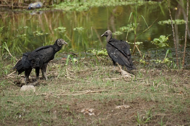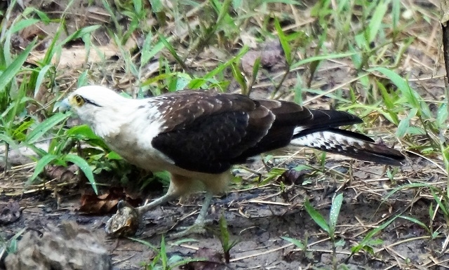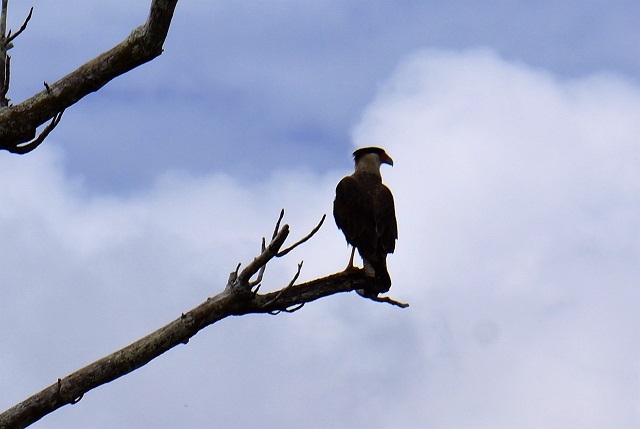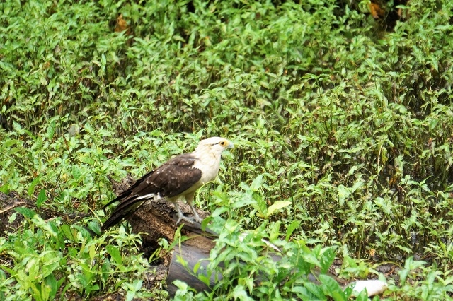 Beim Morgenessen ist noch immer alles grau und es giesst weiterhin. Unser Bootsführer ist unterdessen fischen gegangen und hat reichlich Beute gemacht. Pablo nennt mir alle Arten. Die nicht zum Essen geeigneten Exemplare werden ausgelegt, damit sie von Karakaras, einer Unterfamilie der Falken, geholt werden könne. Es dauert wirklich nicht sehr lange, und zwei dieser Vögel holen sich je ein Stück. Der eine fliegt damit auf ein Dach, ein anderer auf einen am Boden liegenden Baumstamm. Da wird die Beute verzehrt, was wir gut beobachten können.