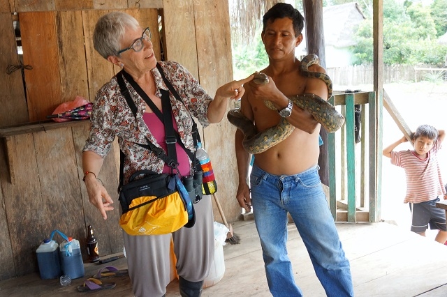 Wir besuchen das Dorf Puerto Miguel, wo sich bei der Entsorgungsstelle ein paar nacktköpfige Rabengeier aufhalten. Gerade bei der Anlegestelle tummeln sich zwei Amazonasdelfine und zeigen immer wieder ihre Rückenflossen. Natürlich wollen auch die Dorfbewohner ihre Raritäten präsentieren. So werden wir zur Dorfbar geleitet, wo uns ein putziges, junges Faultier angehängt wird. Und da sich bei uns der jöh-Effekt einstellt, anerbietet sich ein weiterer Dorfbewohner, für uns seine Anakonda zu holen. Schon bald dürfen wir das Prachtsstück von geschätzten vier Metern Länge bewundern und streicheln. Gerne würde er sie jemandem von uns um die Schultern legen, aber niemand ist bereit dazu. Das Schicksal solcher „Haustiere“ ist oft tragisch, da das nötige Umfeld für eine tiergerechte Haltung fehlt.