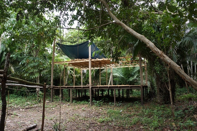 In der Lodge gibt’s feinen Fisch, Reis, Kochbananen und einen gemischten Salat. Anschliessend duschen wir und machen uns frisch. Und dann geniessen wir das Dschungeldasein in der Hängematten-Hütte, allerdings im Schaukelstuhl.