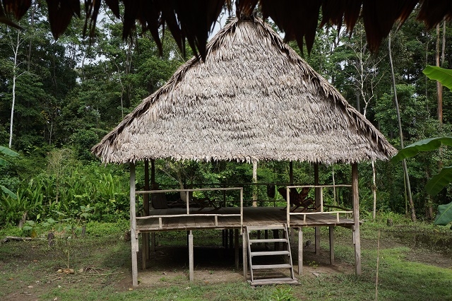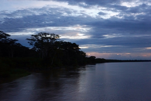 Schon bald nach dem ausgezeichnet schmeckenden Nachtessen gehen wir in die Klappe. Es herrscht keineswegs Ruhe, rundherum zirpt und pfeift und zwitschert es und zwischendurch ertönen auch tiefe Brummtöne oder ein Gezeter. Ich schlafe aber trotzdem schnell ein und höre nur einmal Motorenlärm, wohl von einem auf dem nahen Ucayali vorbeifahrenden Schiff.