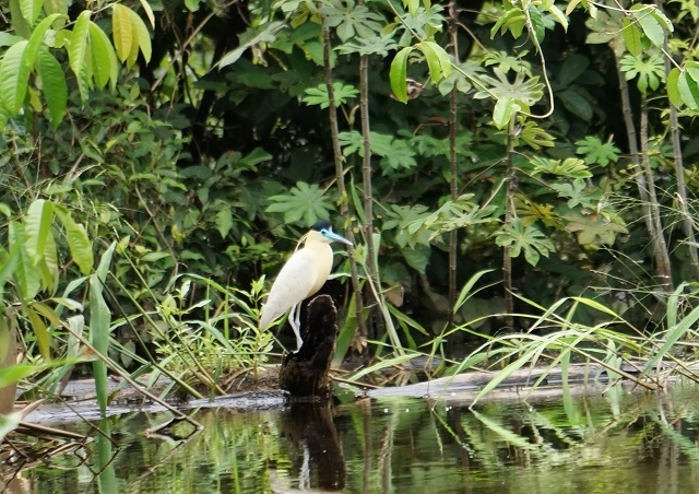 Nach der Passage des Dorfes Vista Alegre schwenken wir in den Rio Yarapo ein und folgen ihm bis zu einem nächsten Nebenfluss. Hier tauchen nun plötzlich verschiedene, teilweise noch nie gesehene Arten auf. Braune Schwalben fliegen um unser Boot herum. Mehrmals können wir Eisvögel, die pfeilschnell über die Wasseroberfläche flitzen, beobachten. Am Ufer stehen weisse Reiher mit bräunlichen Hälsen und einem hellblauen Schnabel (Kappenreiher). Sie fliehen, sobald wir näherkommen. In einem. Strauch, der weit ins Wasser hinausragt, verschwindet ein etwa amselgrosser Vogel mit leuchtend rotem Kopf. Quer zu unserer Bahn fliegen schwarzbraun gefärbte Anis übers Wasser.