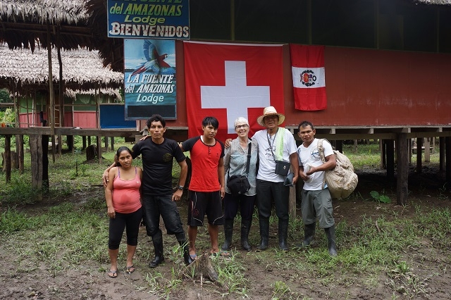 Jetzt kommt der abenteuerlichste Abschnitt unserer Reise zur Lodge. Ein Stück legen wir im Boot zurück, indem vorne Pablo und hinten ein Gehilfe staken. Dann heisst es aussteigen und ein Stück durch glitschigen Sumpf waten. Unterdessen schleppen Pablo und Gehilfen das Boot durch die seichte Stelle. Wir steigen erneut ein. Ein Stück weit geht es per Motor weiter, dann wieder staken, aussteigen, zu Fuss weitergehen, einsteigen, Bootsfahrt… Ordentlich verschwitzt und dampfend erreichen wir die „Fuente del Amazonas Lodge“, wo wir mit markant aufgehängter Schweizer Fahne empfangen werden.